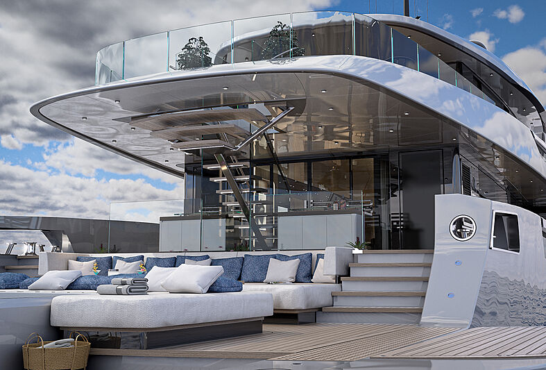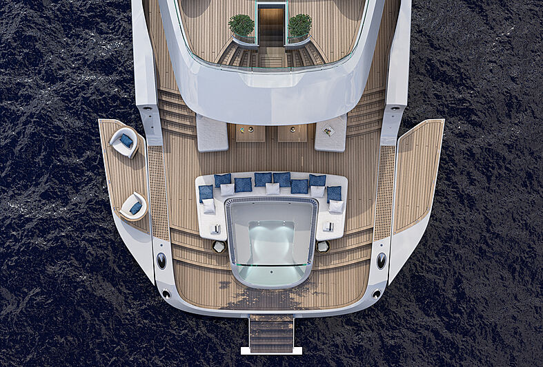 Особое внимание создававшая дизайн экстерьера и интерьеров студия Hot Lab уделила открытому пляжному клубу. Он объединен с кокпитом в зону отдыха, спускающуюся террасами от входа в главный салон к воде. С боков пляжный клуб скрывают откидные фальшборта, на стоянке превращающиеся в купальные платформы. Посреди средней террасы располагаются панорамный бассейн и диван. У 55-метровой модели бассейн с трех сторон опоясывают лежаки. Загорать можно прямо у воды. На верхнем ярусе пляжного клуба установлены две барные стойки, разделенные лестницей, ведущей на верхнюю палубу. Планировка Atlantique 37 предполагает вместо бара место для обеденного стола, но как опцию можно заказать стойку. Места для вечера на свежем воздухе вполне достаточно.