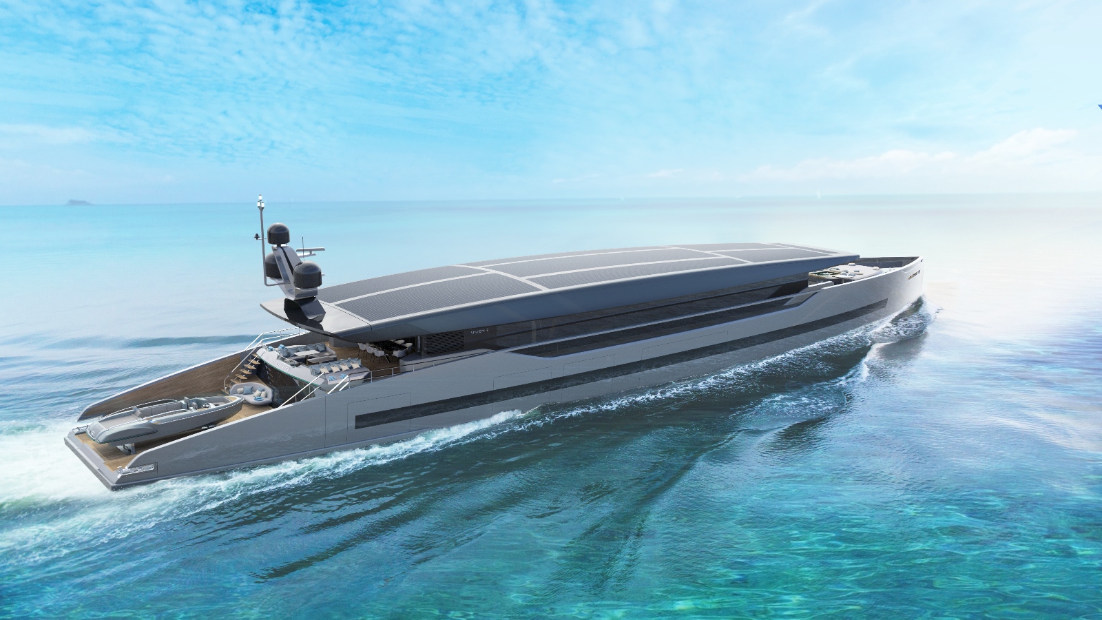 Особенностью мегаяхты длиной 56,7 м с минималистским дизайном станет многоуровневая крыша-трансформер, облицованная солнечными батареями. Среди них будет расположен сандек с баром и джакузи.