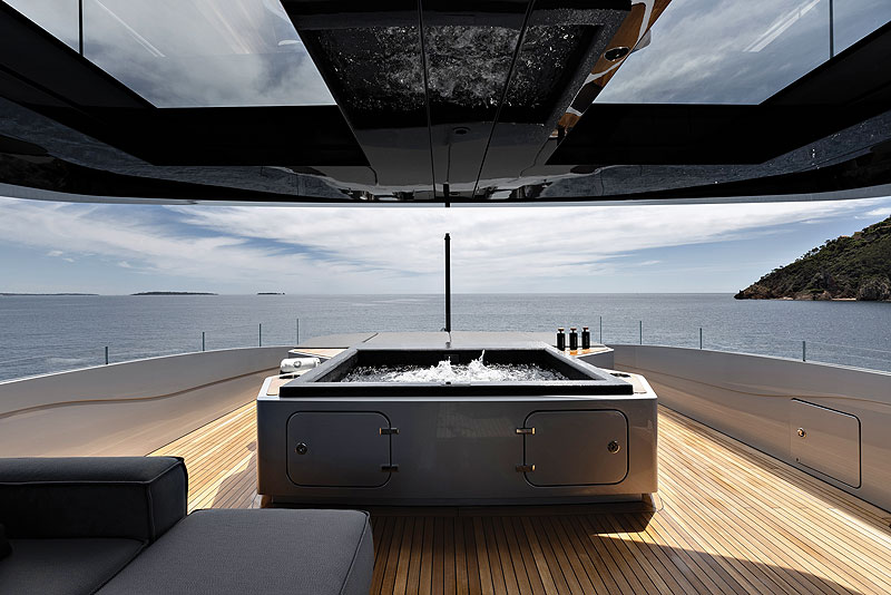 Почти половину длины корпуса занимает флайбридж. Стеклянные панели, закрывающие его от ветра и непогоды, не заслоняют обзор. Впереди установлено квадратное черное джакузи, окруженное лежаками с серой обивкой, а сзади — еще три лежака. В центре под хардтопом находится лакированная барная стойка в стиле ар деко с высокими стульями оттенка венге. За баром установлено дополнительное кухонное оборудование, включая гриль, холодильник и льдогенератор.