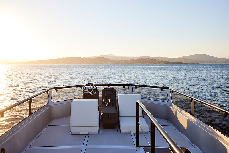 Много места для отдыха предусмотрено на флайбридже с верхним постом управления и солнечными батареями. Планировка полностью кастомизируется. Логично поставить лежаки для загара и превратить это открытое пространство в солярий.