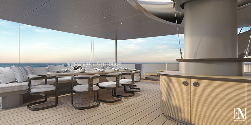 Бóльшую часть верхней палубы занимает солярий с лежаками и диванами. Такая же просторная зона отдыха оборудована и на главной палубе под нависающим козырьком флайбриджа: здесь есть и традиционный лаунж, и обеденный стол, а бизань-мачту окружает барная стойка. К числу интересных дизайнерских находок можно отнести перепад высот на главной палубе: в районе кокпита основной уровень понижается примерно на метр, что делает удобнее спуск к кормовой пляжной зоне, а оттуда и к морю, то есть несмотря на внушительную высоту бортов уже упомянутые откидные террасы в раскрытом положении оказываются у самой воды. Все это и прозрачная задняя стенка бассейна призваны обеспечить визуальный контакт с внешней средой, ведь любоваться природой, по мнению Бриана, — неотъемлемая часть яхтинга. На эту же идею работает и сплошное остекление надстройки, а также прозрачная стена между салоном и кокпитом, которые обеспечивают панорамный обзор на 270 градусов.