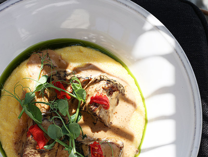 Отличным стартером станет жареный адыгейский сыр с ярким соусом на основе красного вина, вишни и специй, а также три новых салата — с печеной свеклой и сырным муссом, цезарь с курицей или креветками на выбор. В качестве аппетайзера для целой компании шеф советует взять антипасти на кавказский манер с сырами, суджуком, виноградом и вареньем или ассорти солений. Суп с люля пробовали? Очень вкусно и питательно в холодный день. В «Дельфине и Русалке» кебаб из баранины добавляют в солянку. Для веганов надежный способ согреться после прогулки — грибной крем-суп со сливочной эспумой с оттеняющим вкусом трюфельного масла и орехов. На горячее можно порекомендовать тающие во рту телячьи щечки с полентой и сыром пекорино, обжаренную до золотистой корочки буженину в грибном соусе с картофельным пюре и авторский вариант крабовой котлеты с пюре из брокколи под сливочным соусом с икрой.