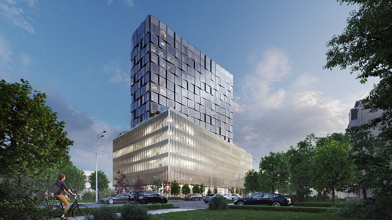 Он строится по проекту топового российского архитектурного бюро «Цимайло Ляшенко и партнеры». Первые шесть этажей займут офисные пространства. Их фасады выглядят строго, по-деловому. Над офисами находится терраса с бесподобными видами, где можно устроить барбекю, пропустить по коктейлю или поработать на свежем воздухе. Выше разместятся 77 видовых апартаментов площадью от 38 до 185 кв. м. Их фасады состоят из стеклянных ячеек панорамных окон. Каждое из них повернуто под своим углом, что создает мерцающий эффект за счет солнечных бликов и преломления света. Только представьте, каждый вечер вы будете подходить к окну размером во всю стену и любоваться Парком Победы, никогда не спящим Москва-Сити, Воробьевыми горами и панорамой всей вечерней столицы.