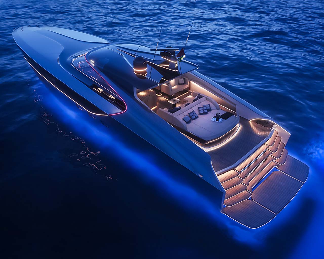 Транец, как сейчас модно, трансформируется. Во время стоянки на воду опускается откидная панель, из нее выезжает дополнительная секция, а из транца выдвигаются ступени. Минималистский интерьер Redaelli e Associati оформили в светлых оттенках.