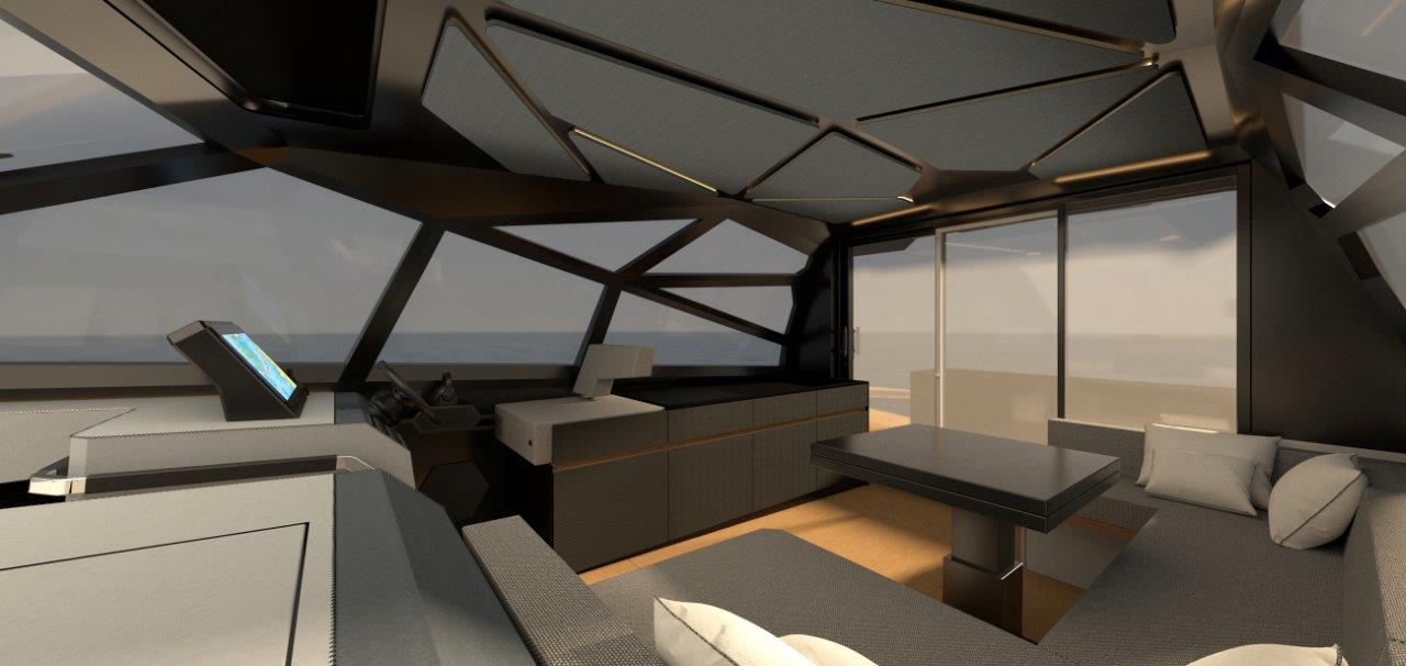 EVO R+ подойдет для круиза не только в ласковом средиземнорском климате, но и под беспощадным солнцем Персидского залива или под дождями и холодными ветрами. Отличительная особенность лодки — очень просторная, высокая кабина с панорамным обзором. С трех сторон ее покрывает многогранная конструкция из стекла и алюминия в фирменном стиле, знакомом по остеклению R6, а от кокпита салон отделяет прозрачная дверь. Солярии расположены на носу и на транце.