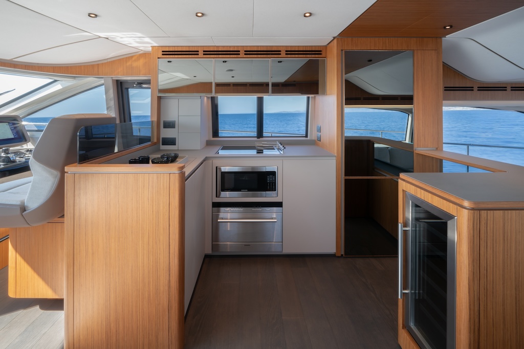 The well-established features include the elegant combination of incredible volumes and light-filled interiors, while the completely renewed ones include the elegant new exterior styling and maximum seating and storage space. The main deck helm station has a windscreen with no central pillar for superb visibility and pilot chairs by Poltrona Frau. The design of the dinette has been modified to improve the ergonomics of the foredeck.