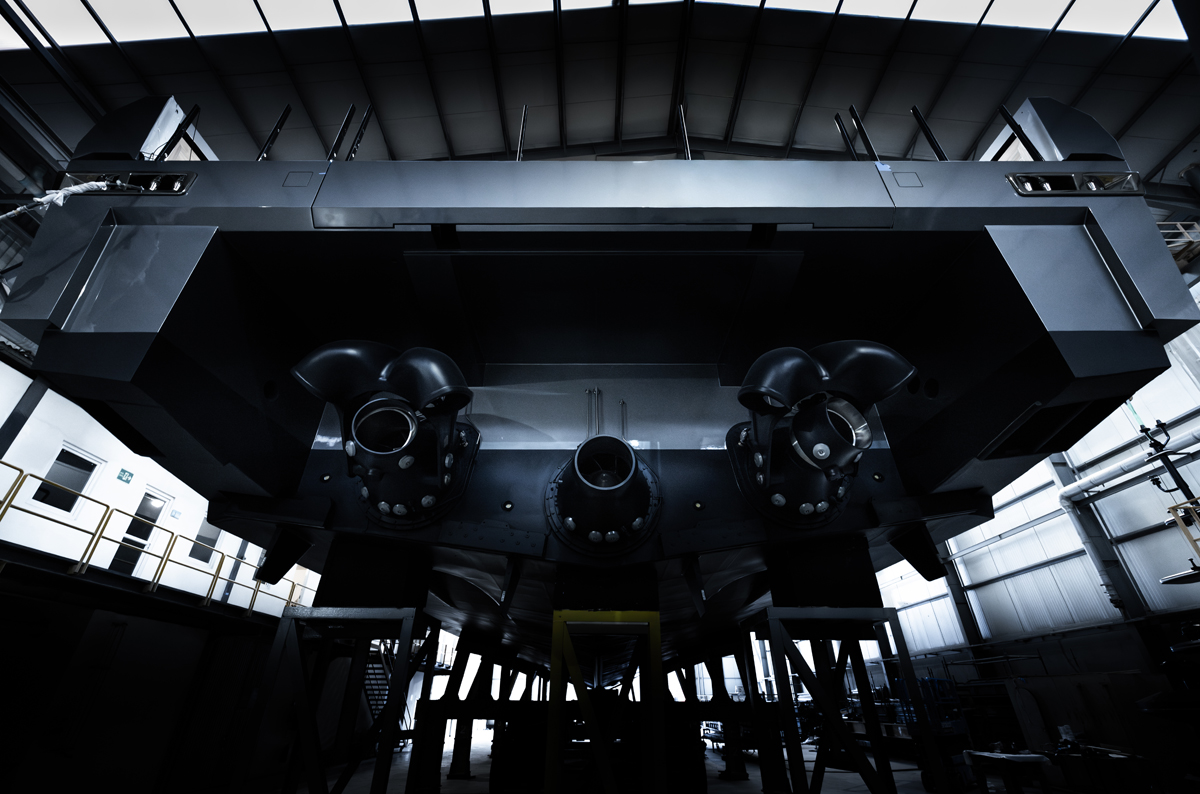 Корпус судна выполнен из высокопрочного алюминиевого сплава Alustar, а надстройка — из углеродного волокна, что обеспечивает сочетание легкости и жесткости конструкции и способствует улучшению ходовых характеристик и топливной эффективности. Три водометных двигателя обещают высокую скорость и маневренность.