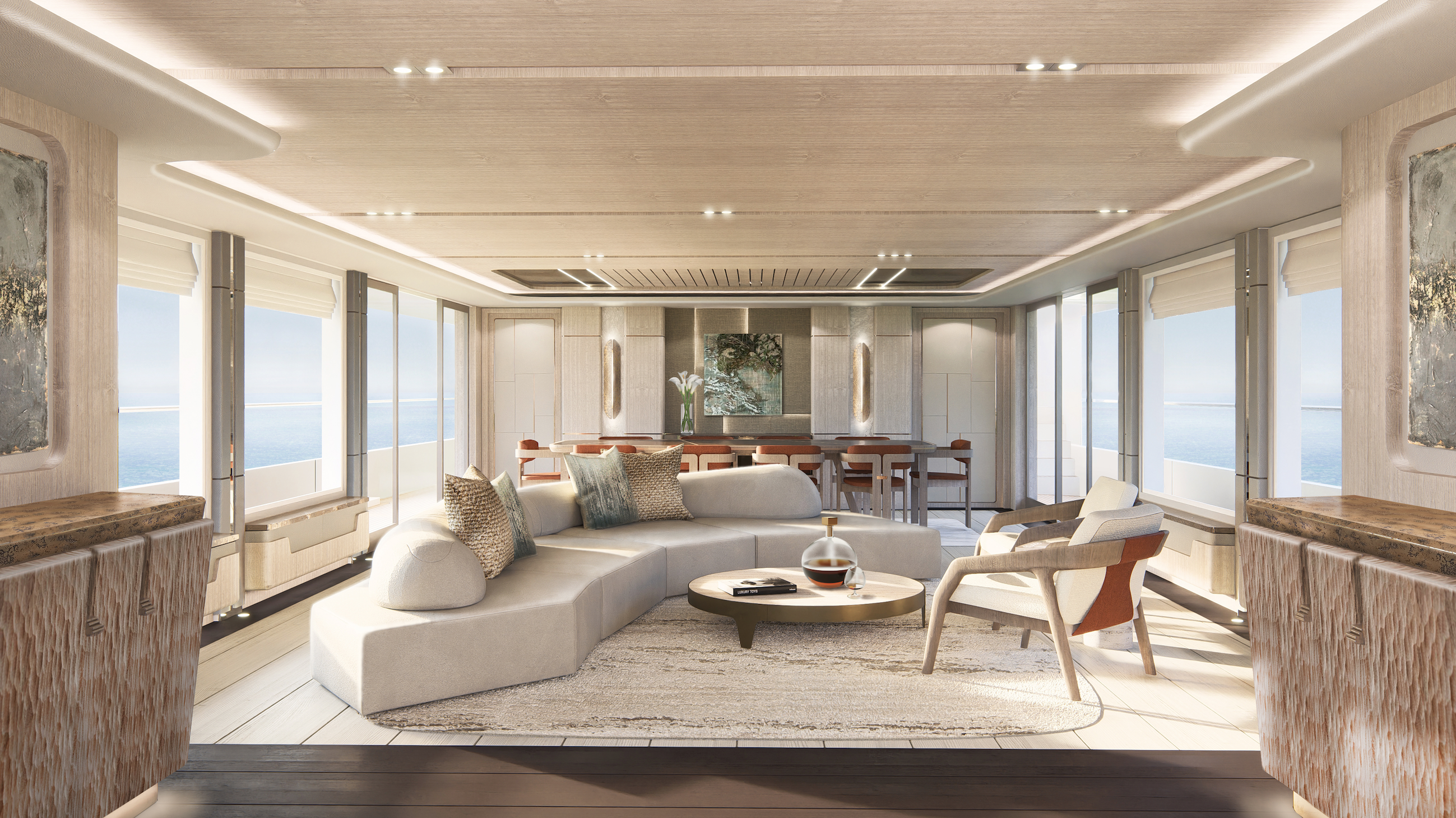- Outdoor Living: A spacious sundeck with a heated spa pool and firepit; a beach club with an integrated pool; a foredeck lounge with an open-air cinema and storage for a 7-metre tender.