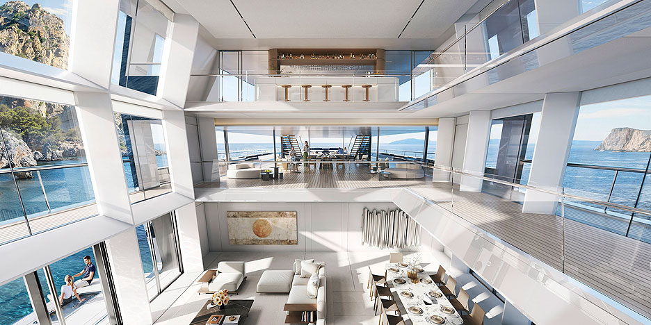 By relocating the engine room from the aft to the forward section of the vessel, the design frees up central and transom areas for living zones featuring double- and triple-height ceilings and panoramic floor-to-ceiling glazing. The elongated hull and this reconfiguration increase open deck spaces by 40%, providing ample room for a pool and a helipad.